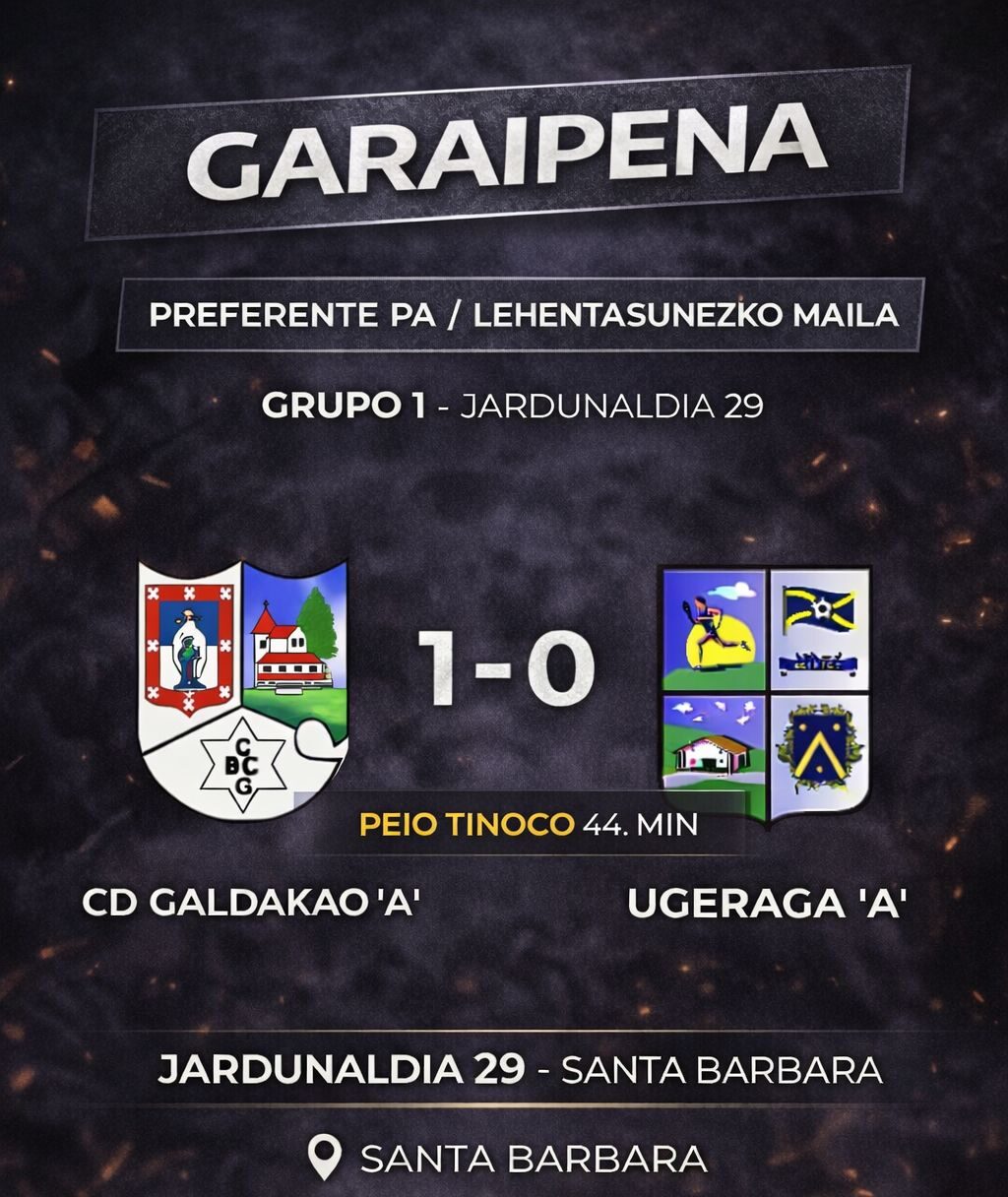 El CD Galdakao de Preferente Regional logró una importante victoria este fin de semana tras imponerse por 1-0 al Ugeraga en Santa Bárbara, en un partido muy trabajado que permite al equipo seguir en la pelea por el ascenso. Con este triunfo, el conjunto galdakoztarra se mantiene en la segunda posición con 55 puntos, a...Read More